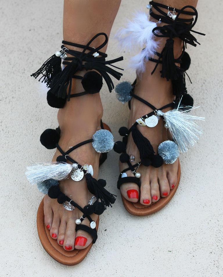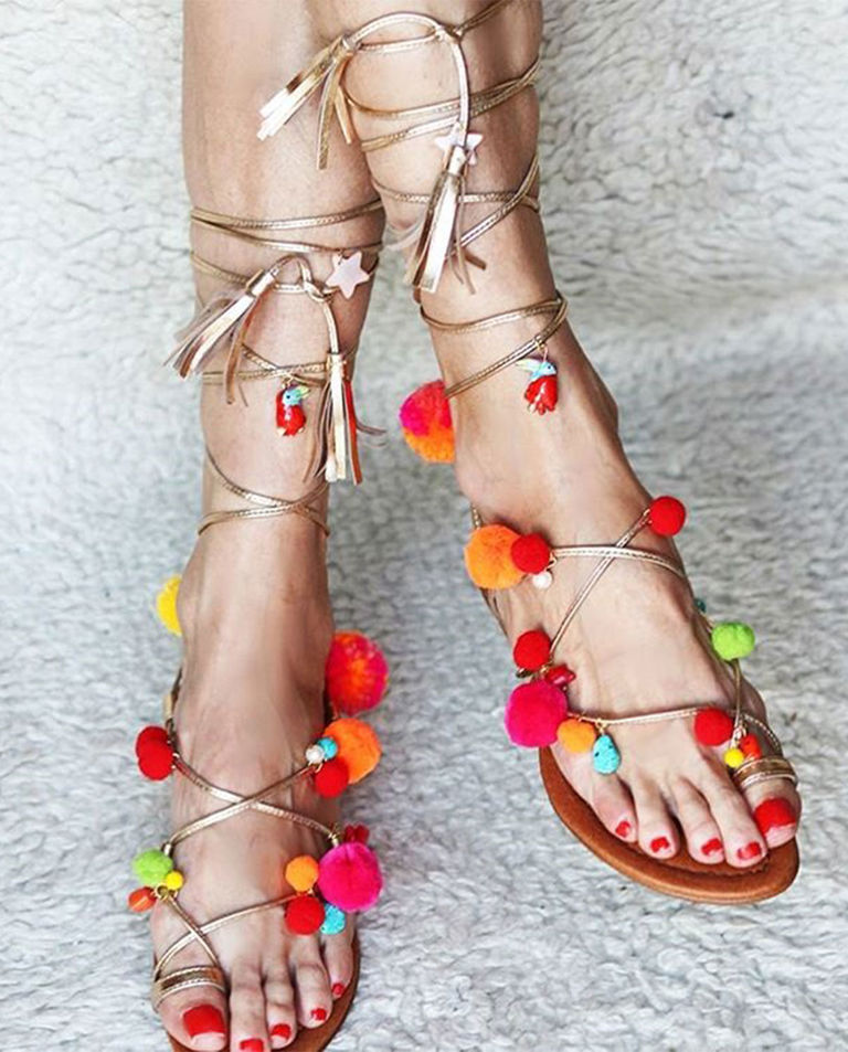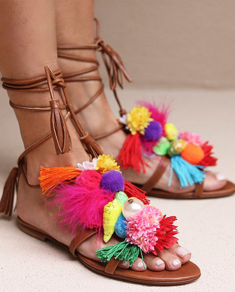 Ogromną popularnością cieszą się płaskie, skórzane sandały Paradise, które wykonane są ze skóry cielęcej i ozdobione ogromną ilością kolorowych pomponów, kwiatów i muszli.