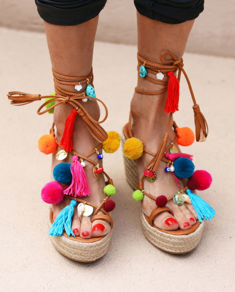 Równie ciekawą propozycją są kolorowe sandały z dużą ilością pomponów oraz z gwiazdkami zawieszonymi na rzemykach.